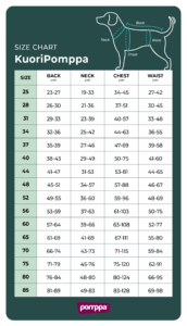 De maten van pomppa zijn gebaseerd op de ruglengte van de hond in centimeters. Kies de juiste maat passend bij de ruglengte van je hond. De pasvorm van de KuoriPomppa is vergelijkbaar met de Sade-, Kevyt- en PerusPomppa echter dankzij de verstelbare nek is er iets meer vrijheid bij het kiezen van de juiste maat. Als je hond tussen twee maten valt kies dan enkel de kleinere maat als je hond zijn staart omhoog draagt. Meet je hond volgens de instructies hieronder. Hou rekening met voldoende ruimte voor de vacht van de hond. Let op, afhankelijk van de verhoudingen van je hond kan de riem niet op het smalste deel van de buik vallen.