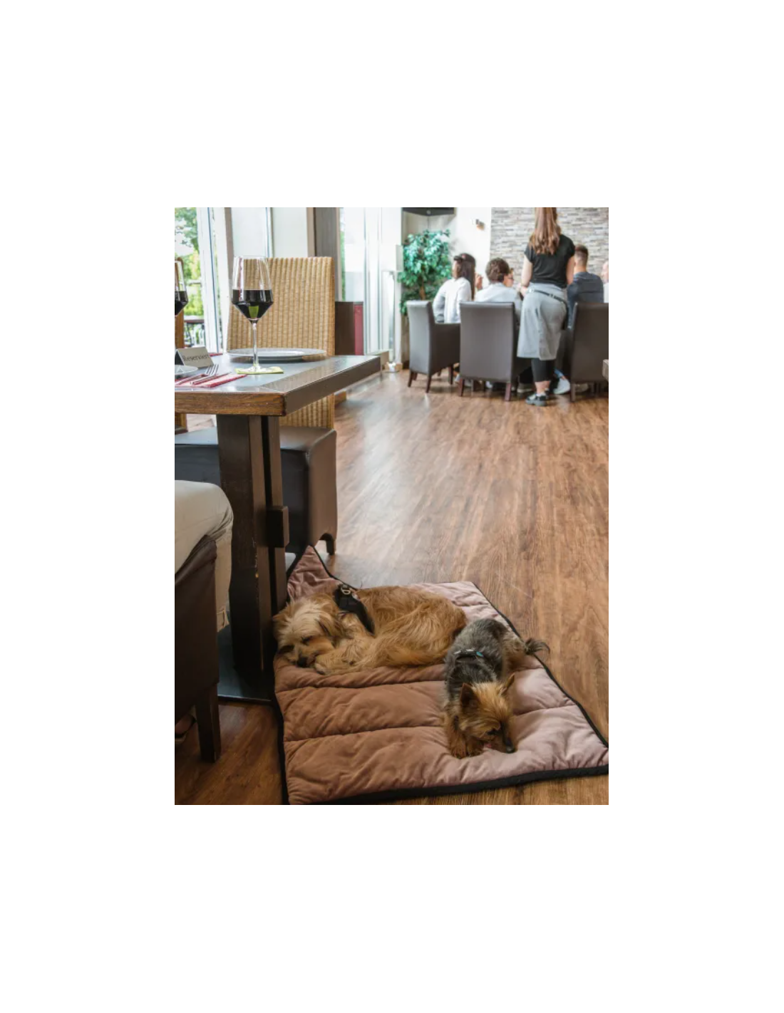 De restaurantdeken laat de hond ook in een onbekende omgeving tot rust komen. Een reeds bekende ligplaats van de hond zorgt voor een ontspannen sfeer. Zo kan de tijd in het restaurant, in het café of in het hotel door alle betrokkenen worden genoten. Dit deken is wasbaar op 30 graden, kan niet in de droger.